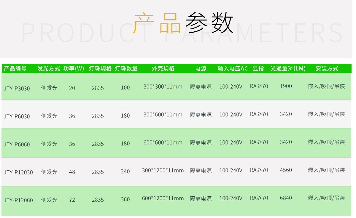 | 側(cè)發(fā)光 | 48 | 2835 | 240 | 600*600*11mm | 隔離電源 | 100-240V | RA≥70 | 3456 | 嵌入,吸頂,吊裝 | |
