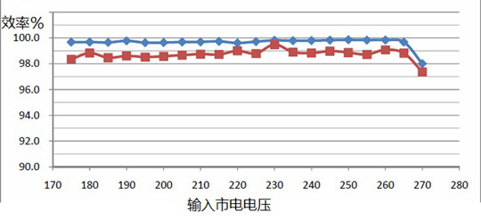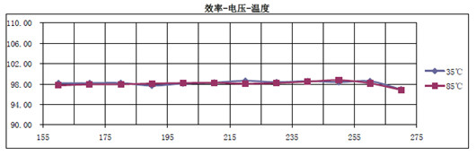 由圖中可以看到,當(dāng)環(huán)境溫度從35度升高到85度時,整個效率隨輸入電壓變化曲線幾乎完全一樣,始終保持在98%以上(包括了整流器的效率在內(nèi))。