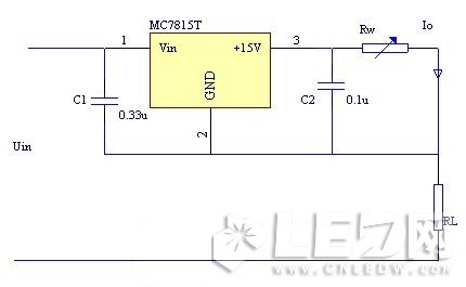 工作原理:固定式集成穩(wěn)壓器工作在正常狀態(tài),在輸出2和公共端3之間接一電位器RW,從而形成一固定恒流源。調(diào)節(jié)RW,可以改變電流的大小,其輸出電流為