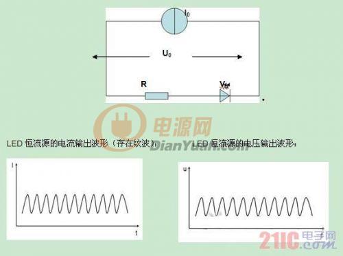假設(shè)LED凈化燈驅(qū)動(dòng)此時(shí)輸出的電流值I0為100mA,R=10Ω,二極管導(dǎo)通電壓Vd=30V,那么實(shí)際的LED燈拉載時(shí),LED驅(qū)動(dòng)的輸出電壓U0=100mA*10Ω+30V=31V,輸出為31V/100mA。假設(shè)恒流源的輸出電流紋波為10mA, LED凈化燈驅(qū)動(dòng)的輸出電壓紋波實(shí)為10mA*10Ω=0.1V。