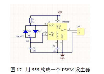 具體獲得PWM信號(hào)的方法為在墻上的PWM開關(guān)和電位器里安裝一個(gè)PWM發(fā)生器。這個(gè)PWM發(fā)生器可以很容易地用一個(gè)555芯片形成(圖17)。