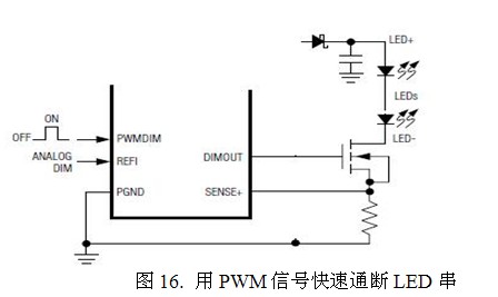 具體實(shí)現(xiàn)PWM調(diào)光的方法就是在LED的負(fù)載中串入一個(gè)MOS開關(guān)管(圖16),這串LED的陽(yáng)極用一個(gè)恒流源供電。